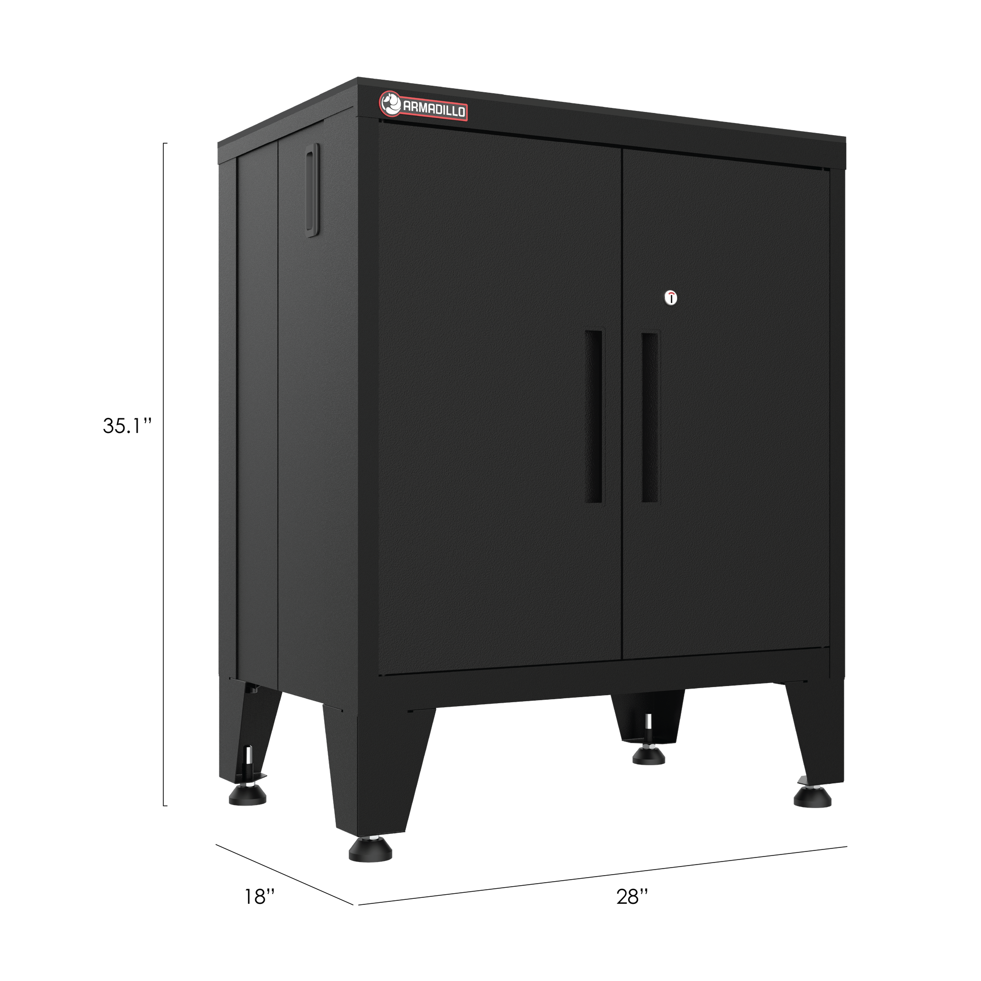 The Armadillo Tough 2-door Garage Cabinet in black offers organizational flexibility with three interior shelves. With a visual lock-unlock indicator, the locking doors open to a spacious garage storage cabinet with two adjustable and one fixed shelf. The two adjustable shelves can be removed if additional space is needed for larger items.