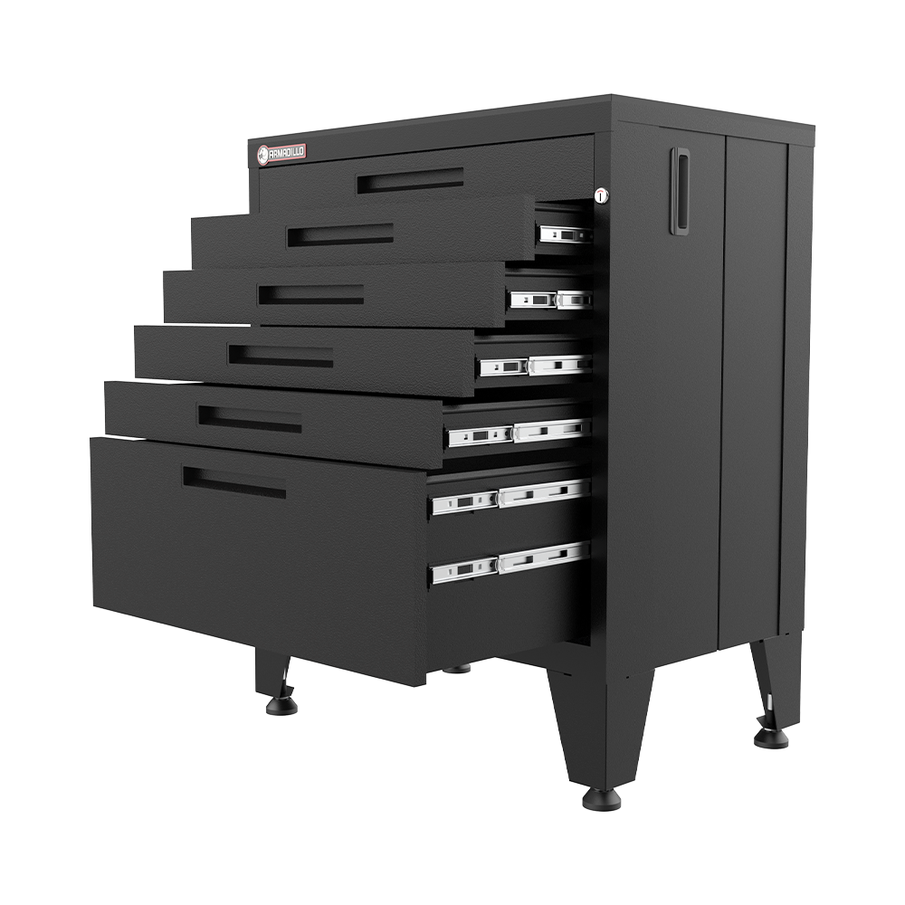 The Armadillo Tough 6-drawer Garage Tool Cabinet in black is ideal for storing all your handheld tools. All six lockable drawers slide on soft-close, quiet, and jam-free full-extension runners. Steel walls provide added strength and durability. The no-slip rubber tool mat top provides the perfect surface to place tools or work on big or small projects.