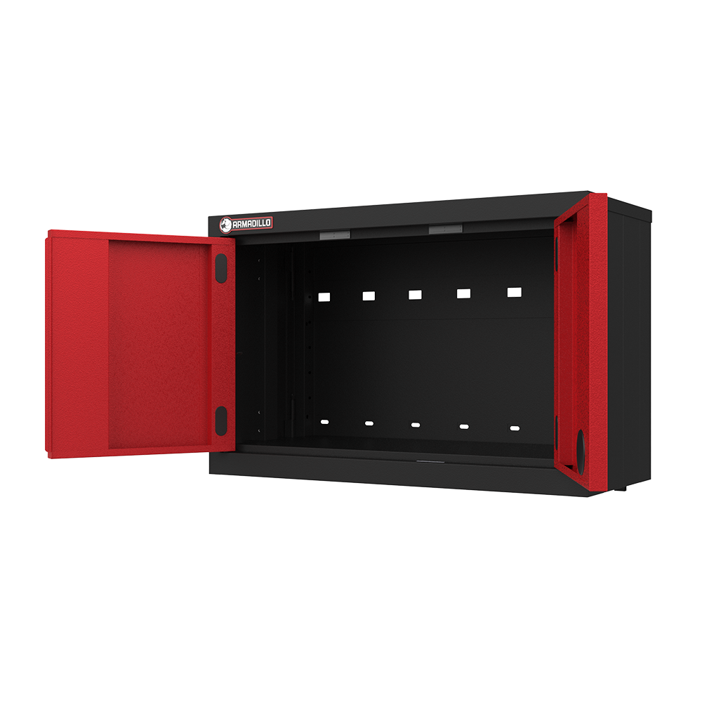 The Armadillo Garage Wall Cabinet in red allows you to keep hazardous products and dangerous equipment safe and out of reach. Mount 2-3 together to maximize space in your garage or workspace. Locking doors with a visual lock-unlock indicator and clean recessed handles provide added security. With our easy-to-mount installation guide, you will have these units on your wall and your items organized quickly!